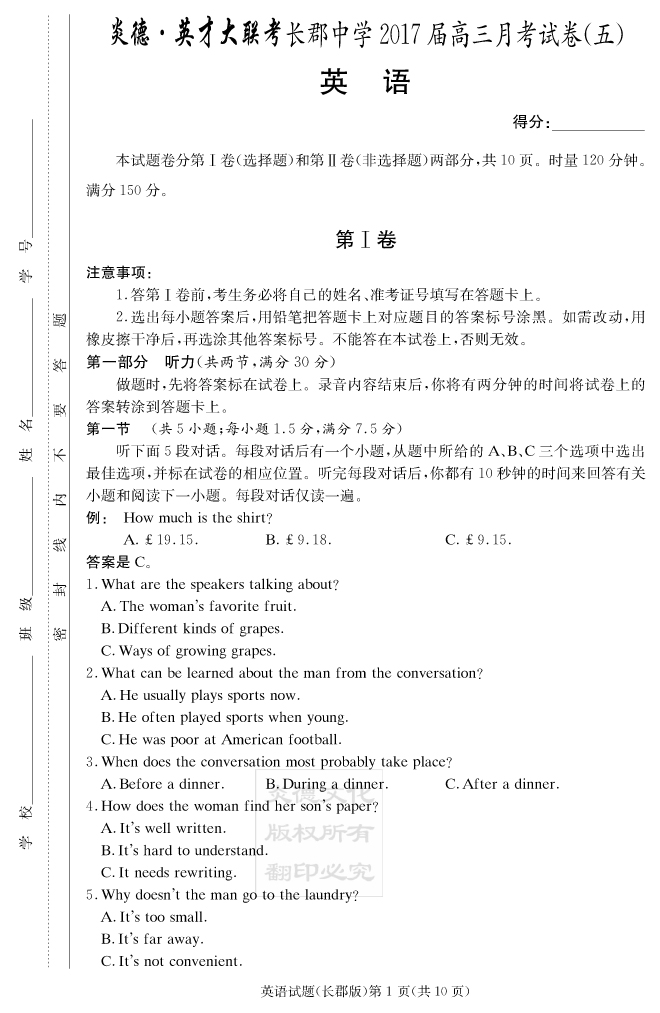 【英語】炎德英才大聯考2017長郡中學高三5次月考