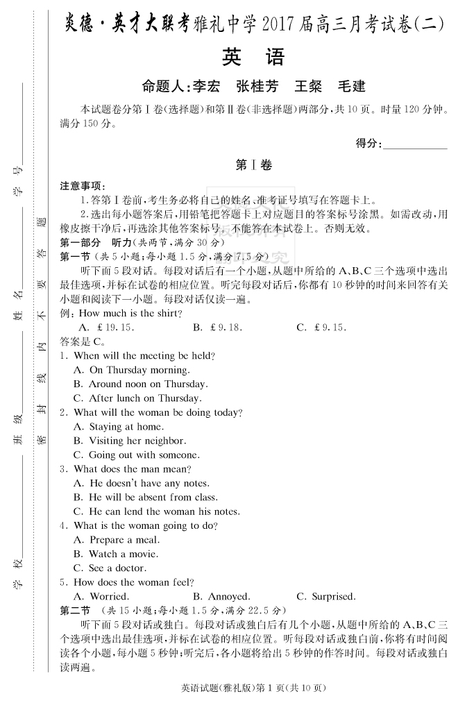 【英語(yǔ)】炎德英才大聯(lián)考2017雅禮中學(xué)高三2次月考