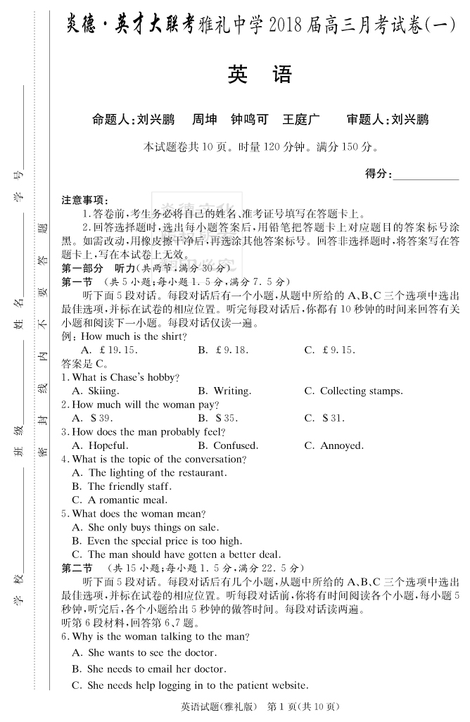 【英語】炎德英才大聯(lián)考2018雅禮中學(xué)高三1次月考