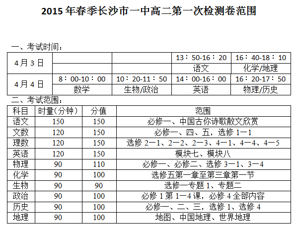2015年春季長沙市一中高二第1次月考考試時(shí)間和范圍(2015.04.03-04)