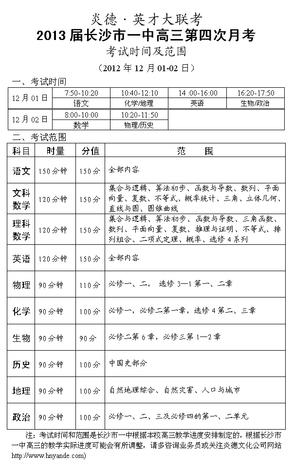 炎德英才大聯考長沙市一中2013屆高三第四次月考考試時間和范圍