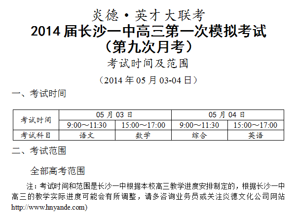 下一篇:炎德英才大聯考長沙市一中2015屆高三第1次月考考試時間和范圍(2014.08.22-23)