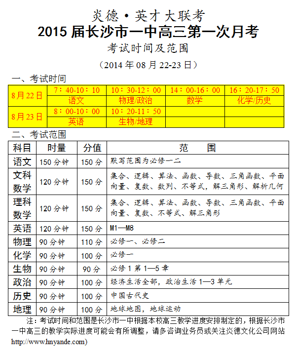 炎德英才大聯(lián)考長(zhǎng)沙市一中2015屆高三第1次月考考試時(shí)間和范圍(2014.08.22-23)