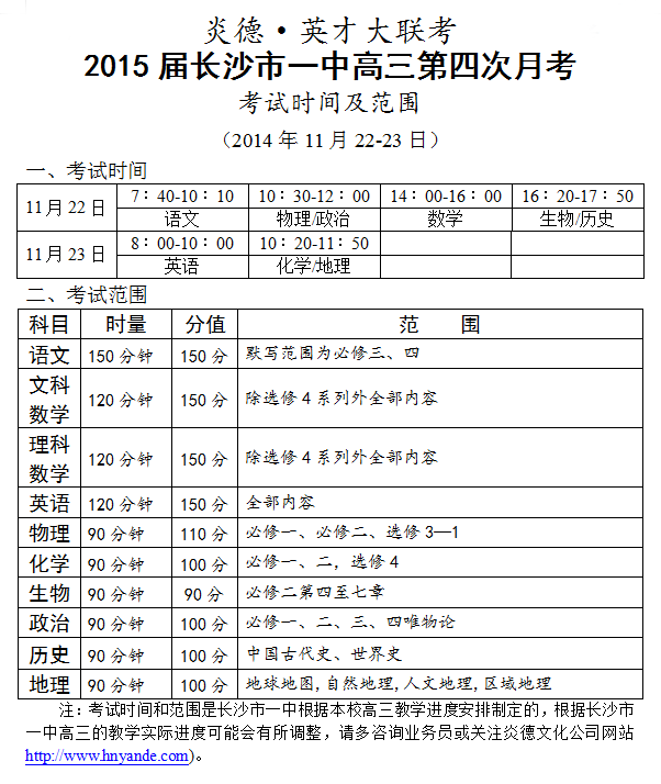炎德英才大聯考長沙市一中2015屆高三第4次月考考試時間和范圍(2014.11.22-23)