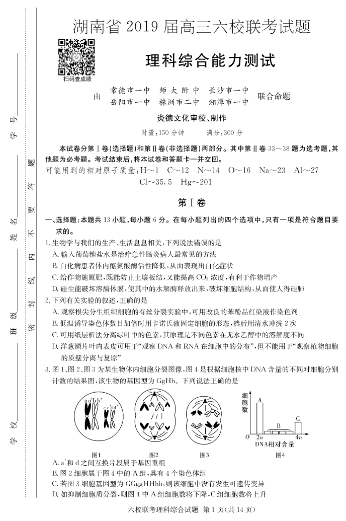 【理綜】湖南省2019屆高三六校聯考