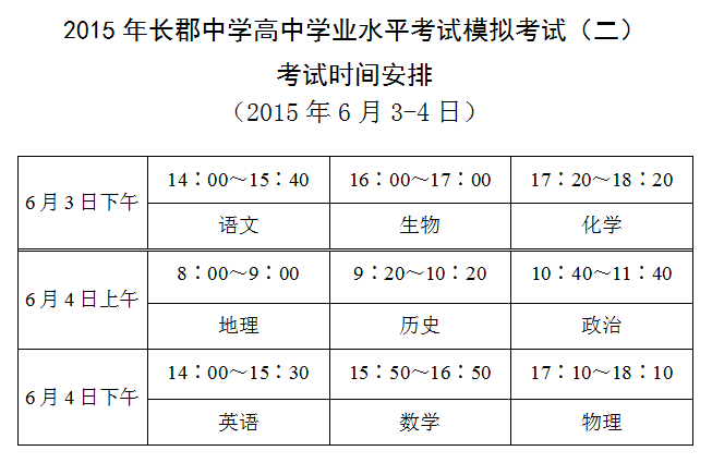 2015春季長(zhǎng)郡中學(xué)高二學(xué)業(yè)水平考試仿真模擬試卷二考試時(shí)間安排(2015年6月3-4日)