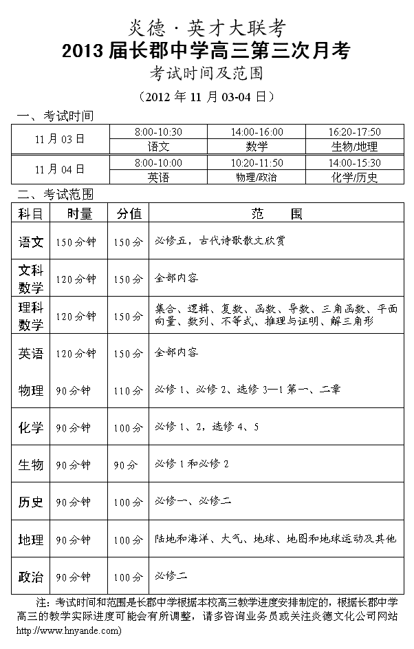 炎德英才大聯考長郡中學2013屆高三第三次月考考試時間和范圍
