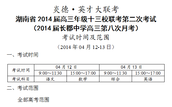 下一篇:炎德英才大聯考長郡中學2014屆高三第一次模擬(第9次月考)考試時間和范圍(2014.05.0
