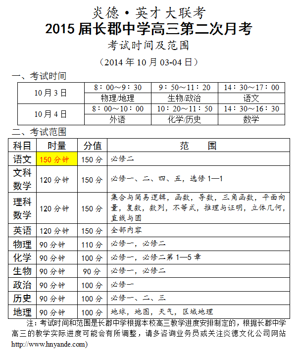 炎德英才大聯考長郡中學2015屆高三第2次月考考試時間和范圍(2014.10.03-04)