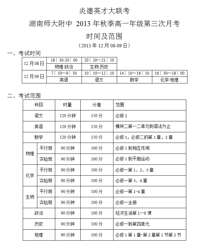2013年秋季師大附中高一年級第三次月考考試時間及范圍(2013.12.06-07)