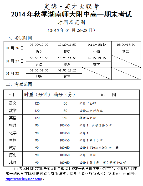 炎德英才大聯考2014年秋季湖南師大附中高一期末月考考試時間和范圍(2015.01.26-28)