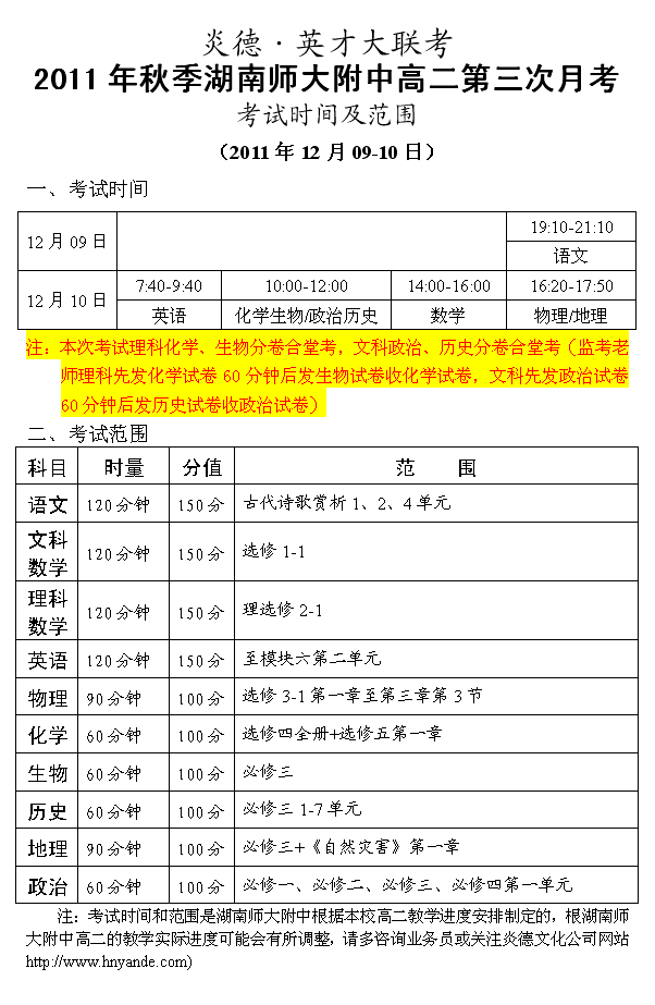 2011秋季湖南師大附中高二第三次月考考試時間和范圍