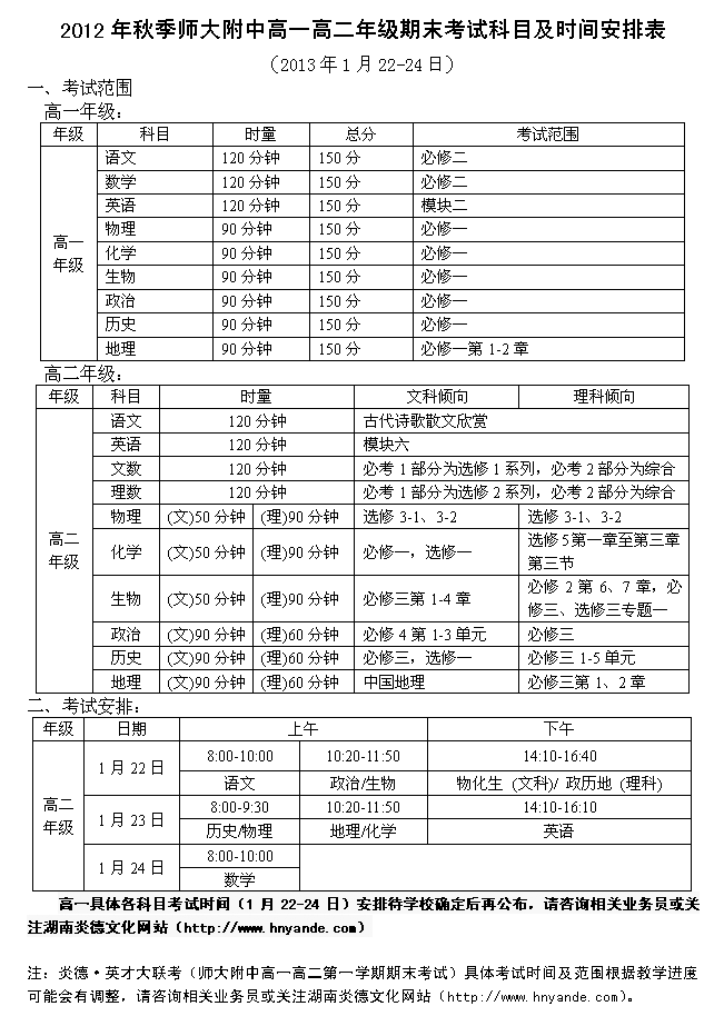 2012年秋季師大附中高一高二期末考試(第四次月考)時間范圍(2013.01.22-24)