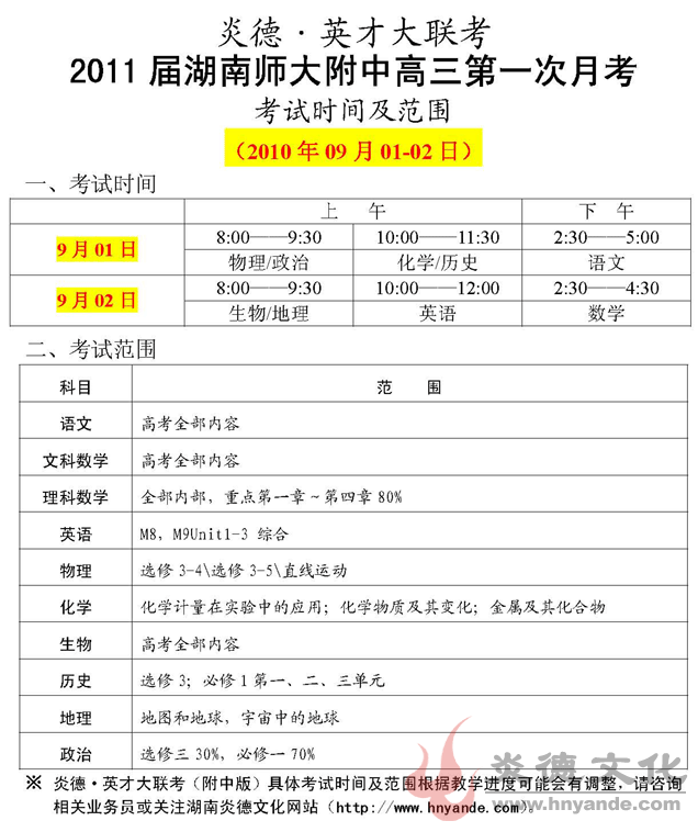 炎德英才大聯考湖南師大附中2011屆高三第一次月考考試時間和范圍