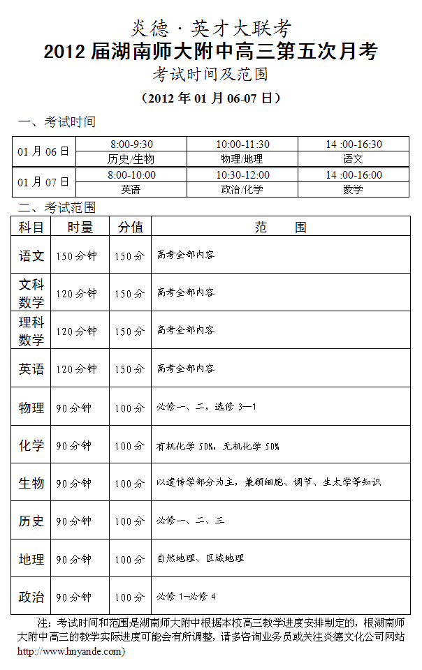 [含聽(tīng)力]炎德英才大聯(lián)考湖南師大附中2012屆高三第五次月考考試時(shí)間和范圍