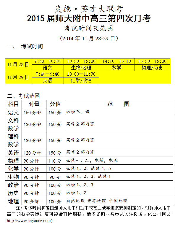 上一篇:炎德英才大聯考師大附中2015屆高三第3次月考考試時間和范圍(2014.10.31-11.01)