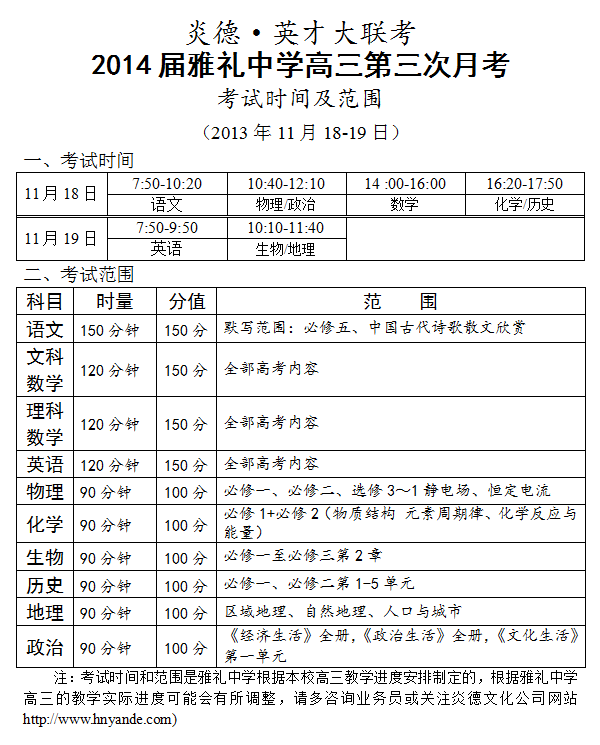 炎德英才大聯考雅禮中學2014屆高三第3次月考考試時間和范圍(2013.11.18-19)