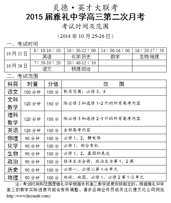 炎德英才大聯(lián)考雅禮中學(xué)2015屆高三第2次月考考試時(shí)間和范圍(2014.10.25-26)