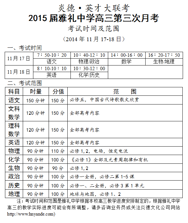 炎德英才大聯考雅禮中學2015屆高三第3次月考考試時間和范圍(2014.11.17-18)