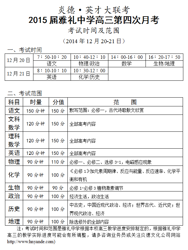 下一篇:炎德英才大聯考雅禮中學2015屆高三第5次月考考試時間和范圍(2015.01.19-20)