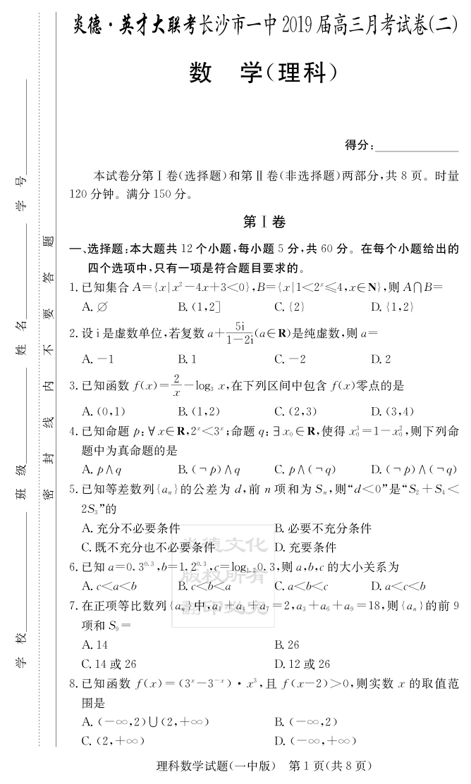 【理數(shù)】炎德英才大聯(lián)考2019長沙一中高三2次月考