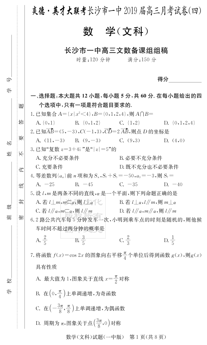 【文數(shù)】炎德英才大聯(lián)考2019長沙一中高三4次月考