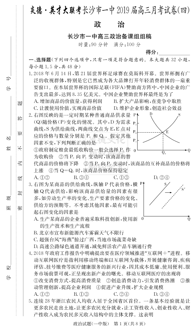 【政治】炎德英才大聯(lián)考2019長沙一中高三4次月考