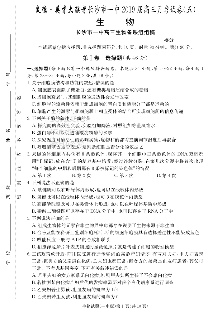 2026湖南師大附中新高考考前小題訓練·生物