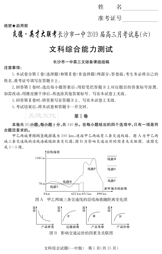 【文綜】炎德英才大聯考2019長沙一中高三6次月考