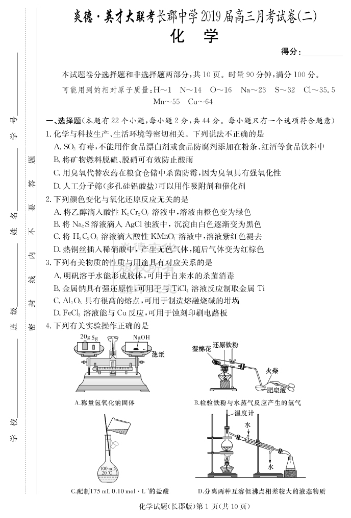 【化學】炎德英才大聯考2019長郡中學高三2次月考