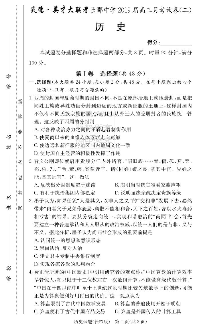 2026長郡中學新高考考前小題沖刺訓練·歷史
