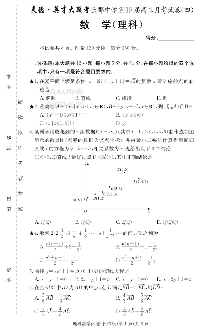 【理數】炎德英才大聯考2019長郡中學高三4次月考