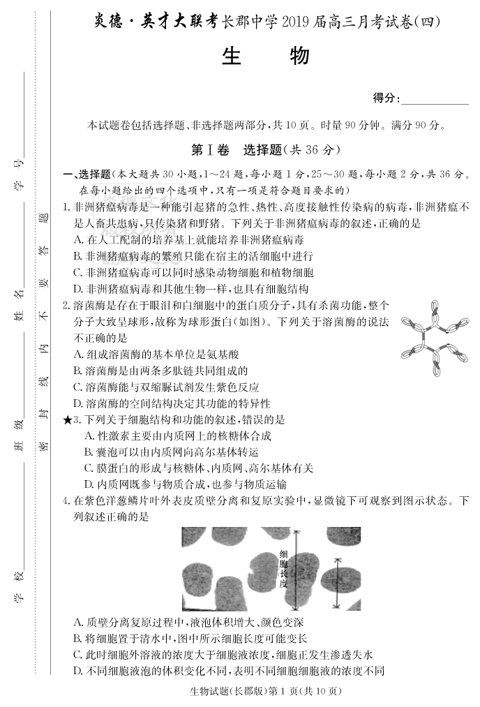 【生物】炎德英才大聯(lián)考2019長(zhǎng)郡中學(xué)高三4次月考