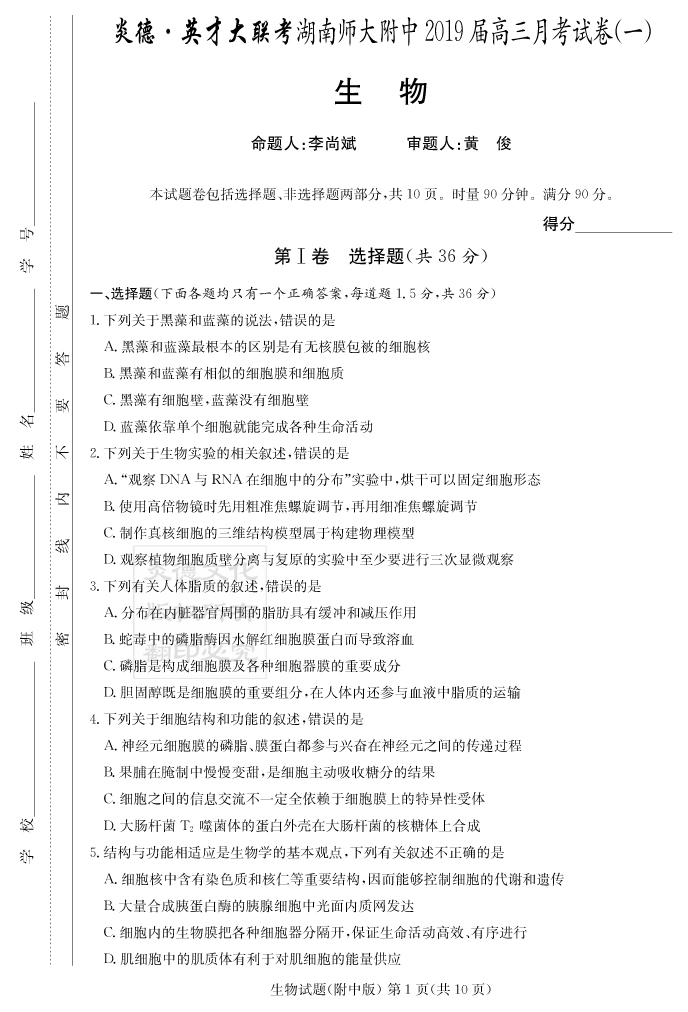 【生物】炎德英才大聯考2019師大附中高三1次月考