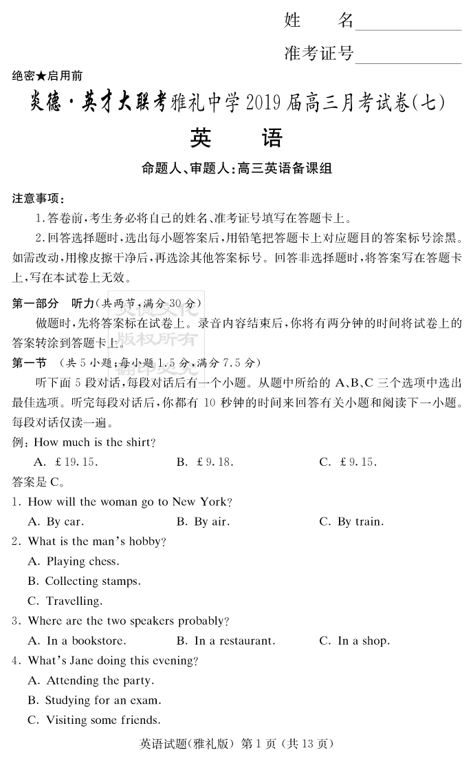 【英語】炎德英才大聯考2019雅禮中學高三7次月考