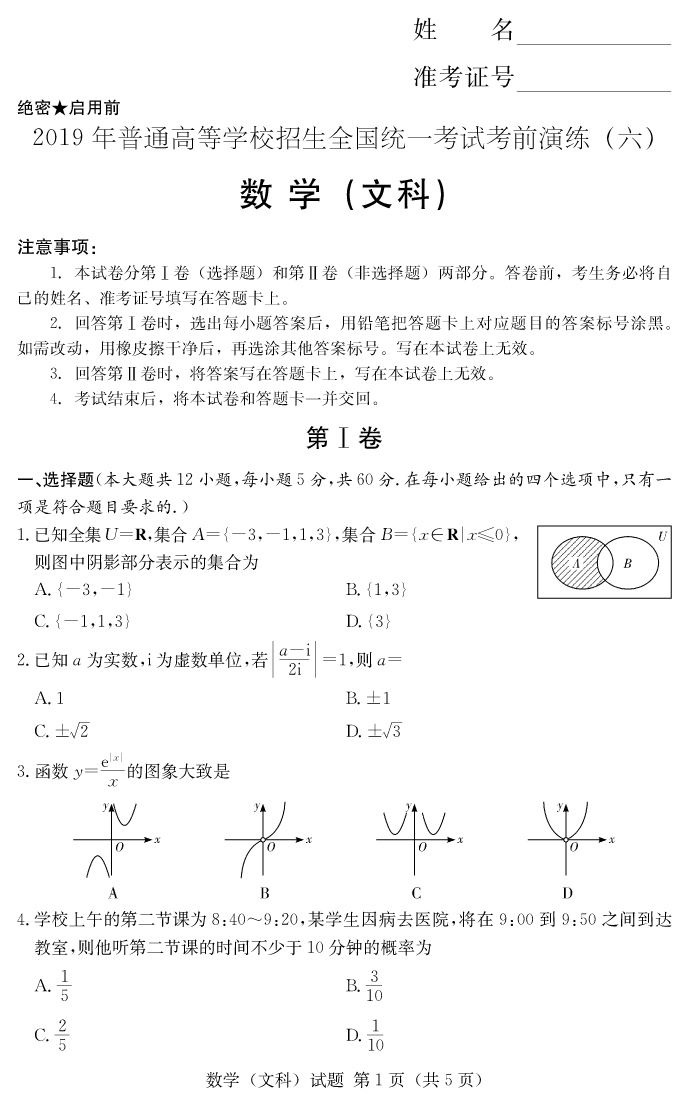 【文數】2019年普通高等學校招生全國統一考試考前演練(六)