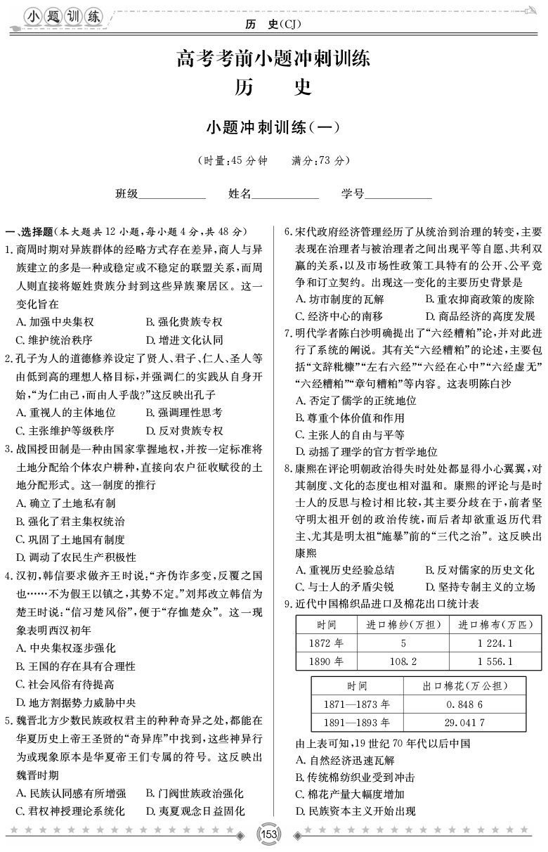 2026湖南師大附中新高考考前小題訓練·歷史