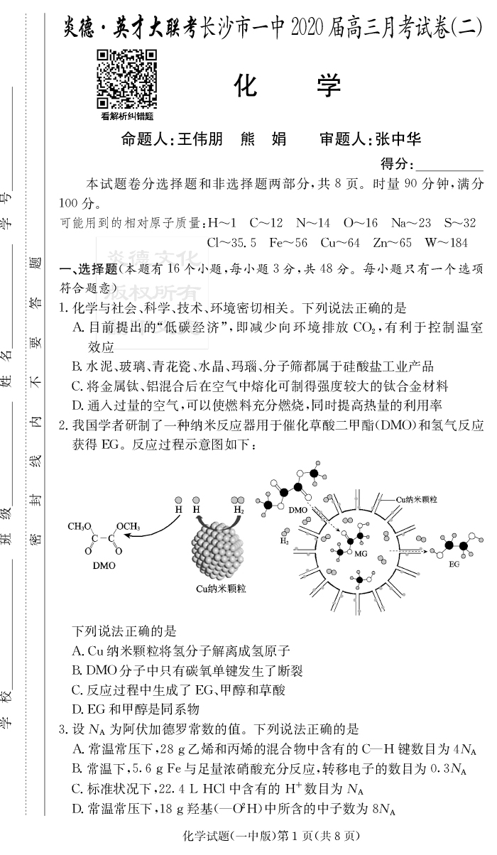 2026長郡中學新高考考前小題沖刺訓練·化學