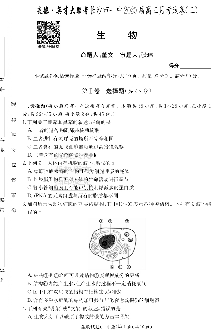 2026湖南師大附中新高考考前小題訓練·生物