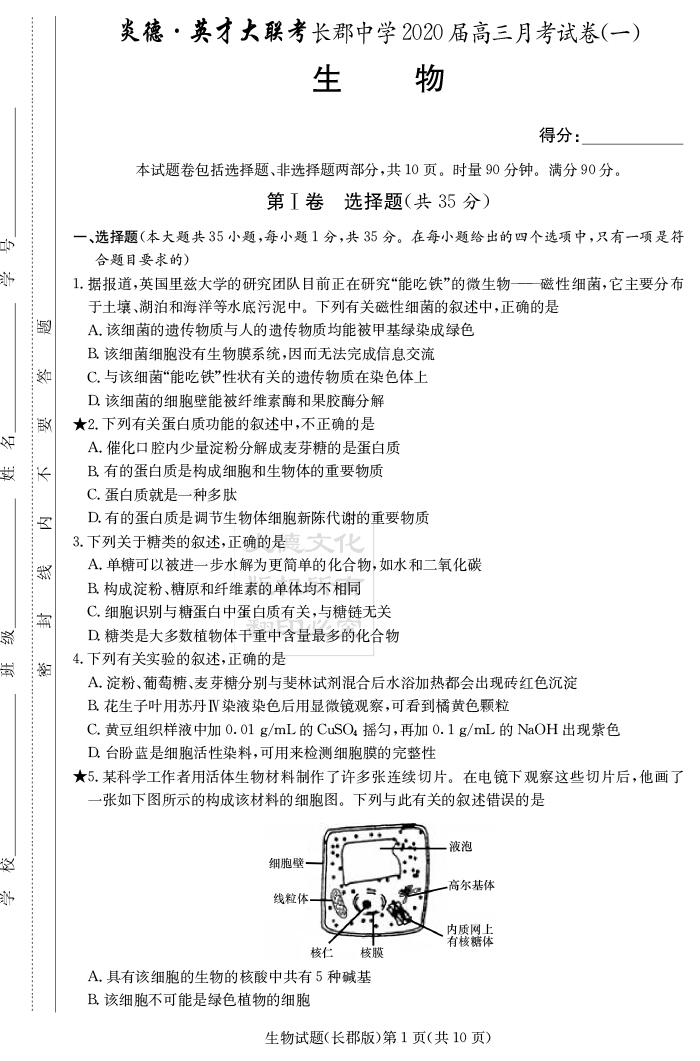 【生物】炎德英才大聯考2020屆長郡中學高三1次月考