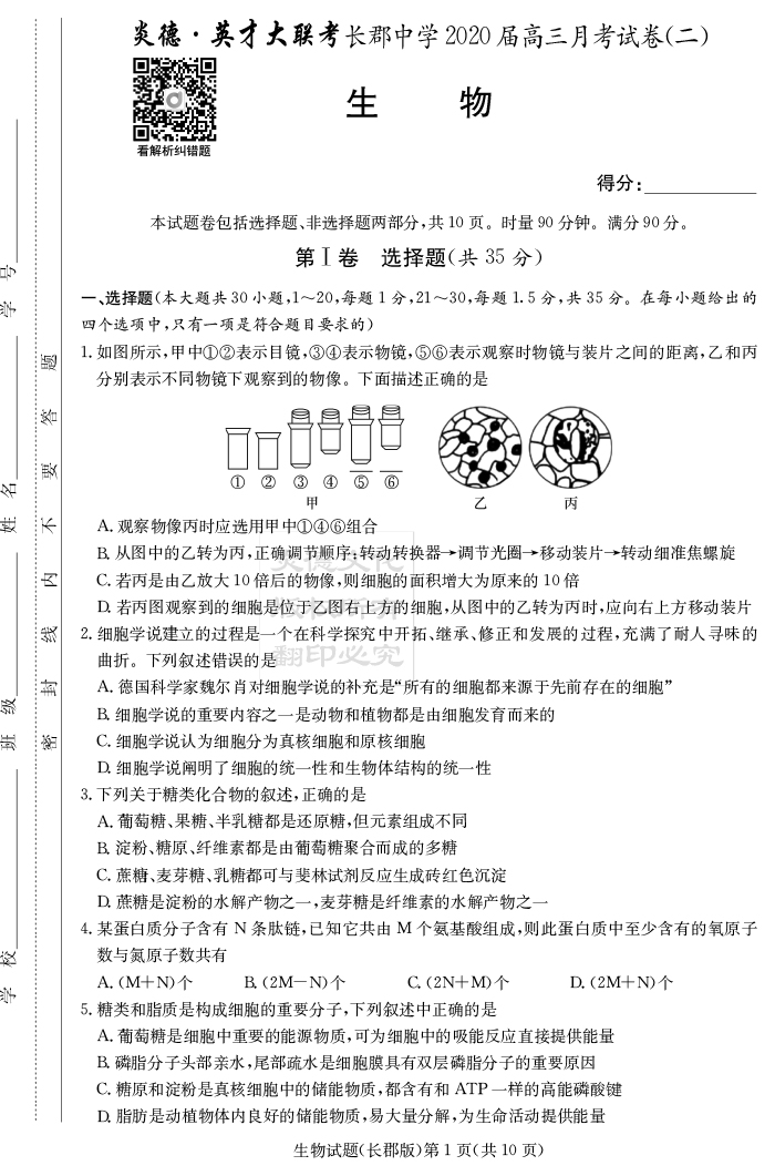 2026長郡中學新高考考前小題沖刺訓練·生物