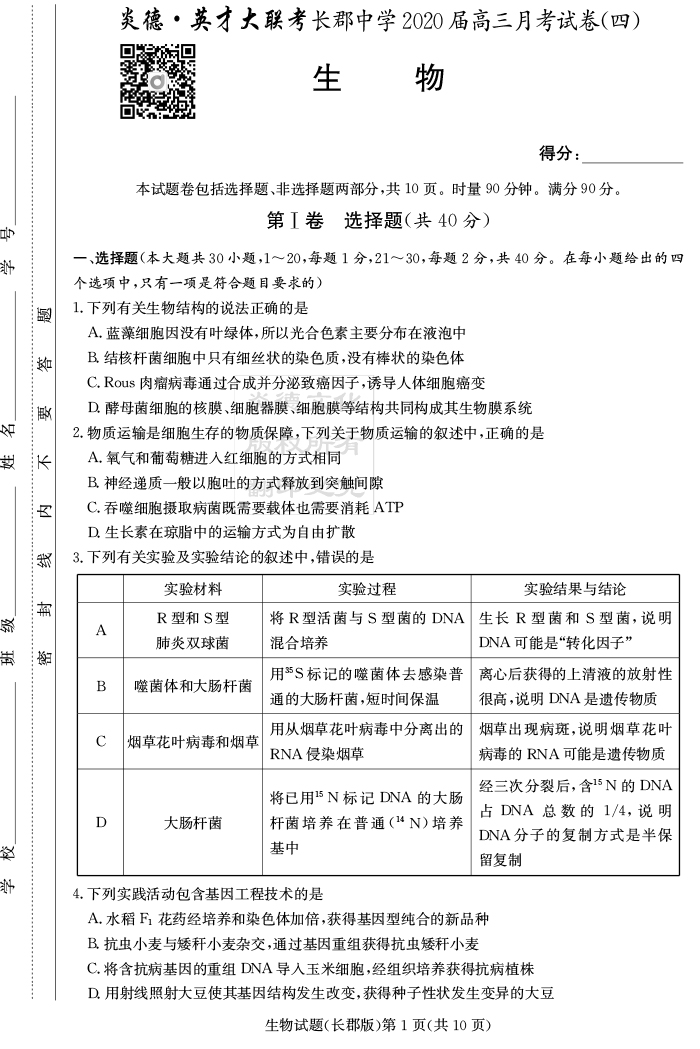 2026長郡中學新高考考前小題沖刺訓練·生物