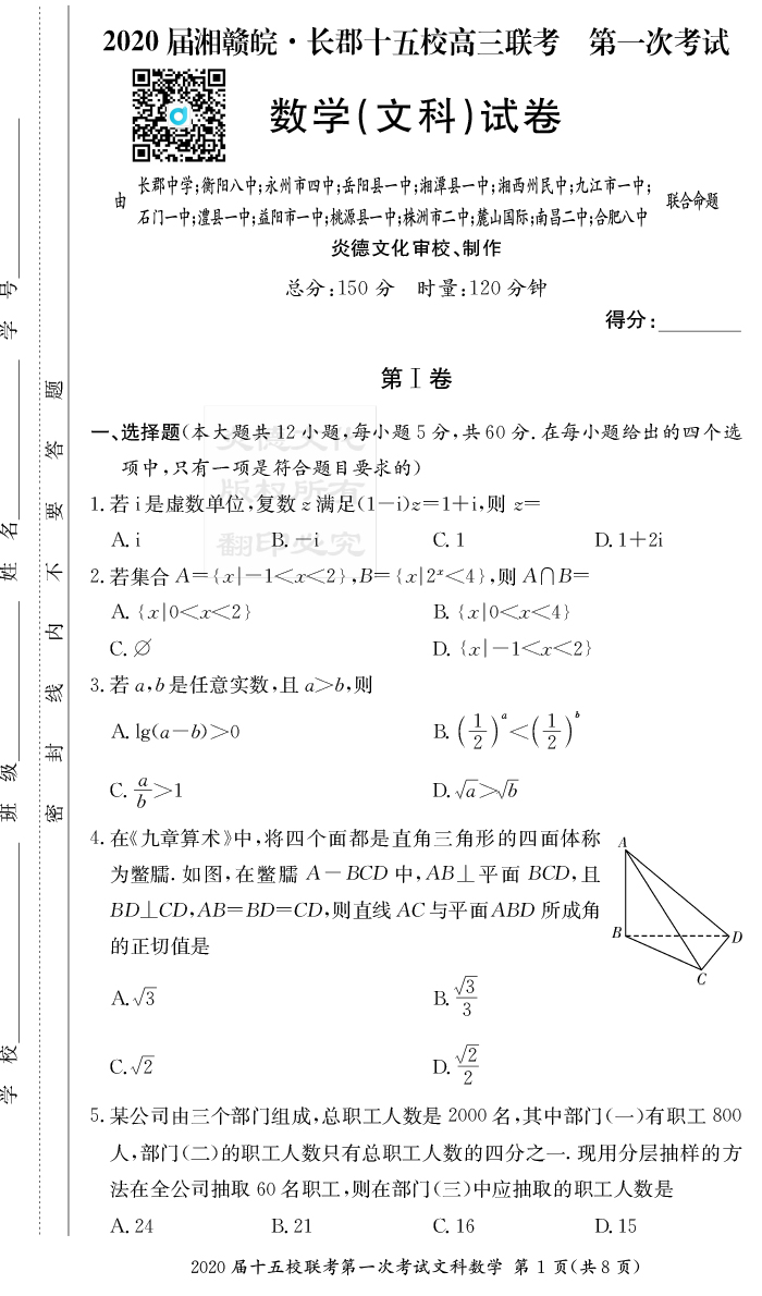 【文數(shù)】炎德英才大聯(lián)考2020屆長郡中學高三7次月考(十五校聯(lián)考一)