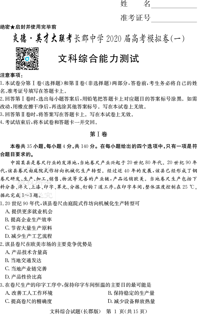 【文綜】炎德英才大聯考2020屆長郡中學高三9次月考(模擬一)