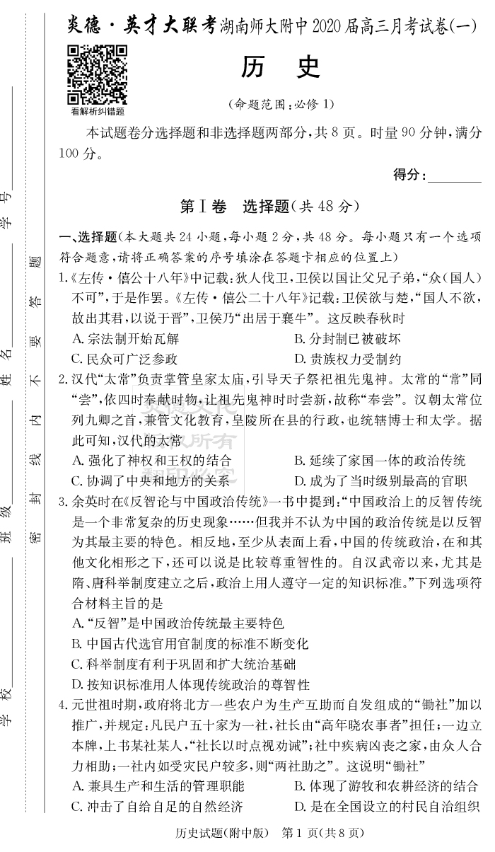 2026湖南師大附中新高考考前小題訓練·歷史