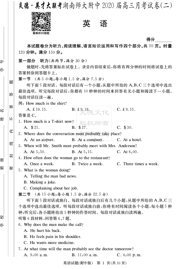 【英語】炎德英才大聯考2020屆師大附中高三2次月考