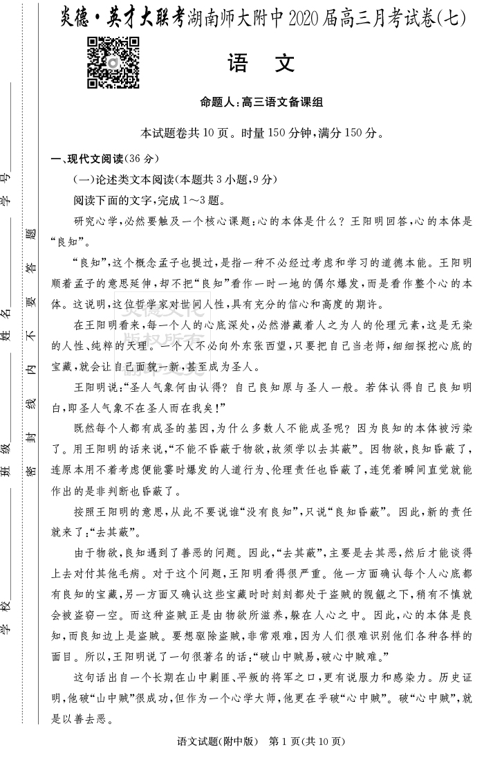 2026湖南師大附中新高考考前小題訓練·語文