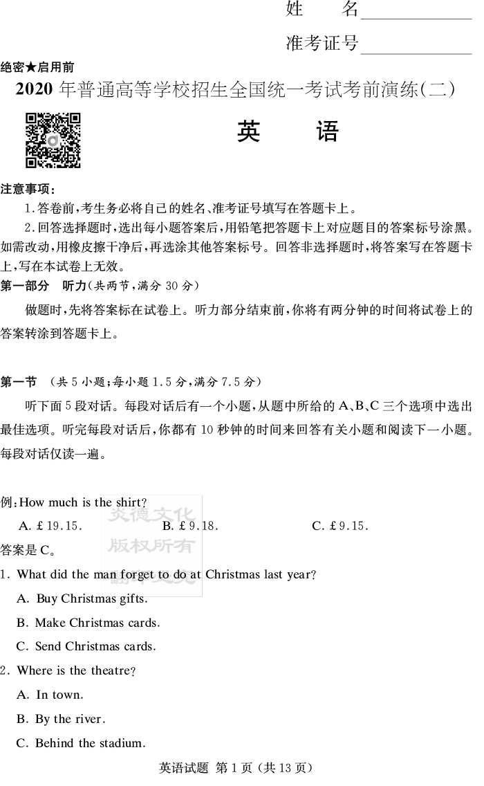 下一篇:【語文】2020年普通高等學校招生全國統一考試考前演練(二)