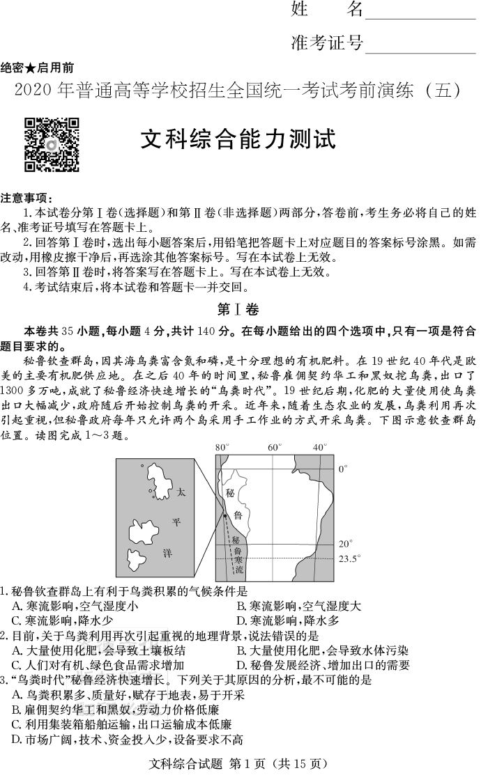 【文綜】2020年普通高等學校招生全國統一考試考前演練(五)