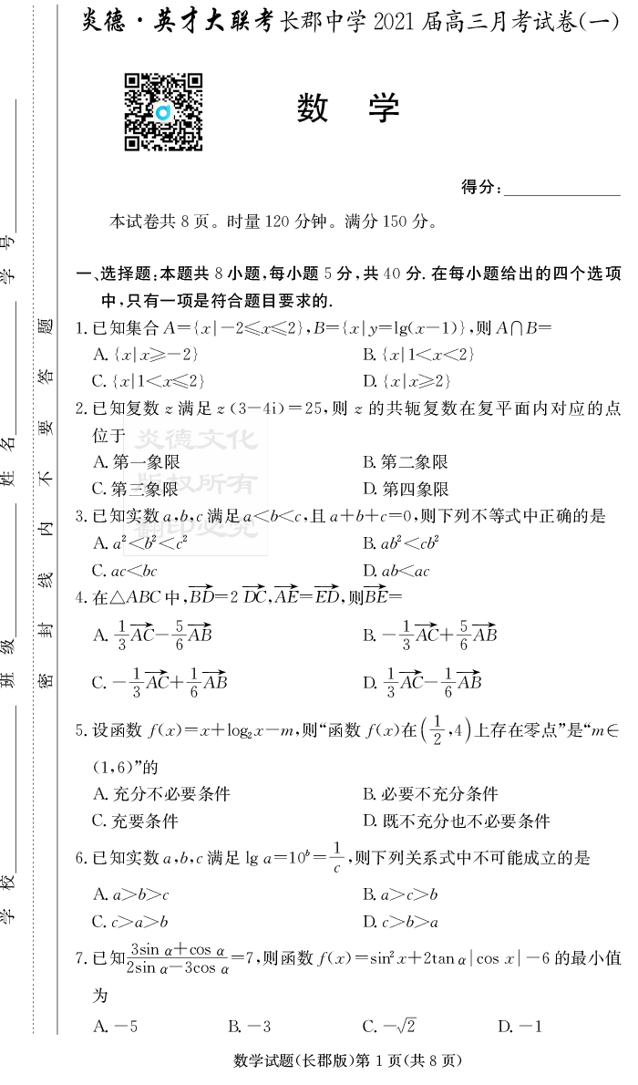 【數學】炎德英才大聯考2021屆長郡中學高三1次月考
